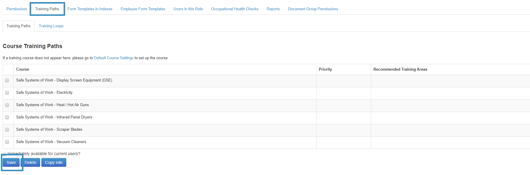 Click on the Training Paths tab, scroll down to the relevant department for the role and tick the courses that are applicable, for example Fuel Retrieval and Handling. Click Save at the bottom of the page once the relevant courses are ticked.